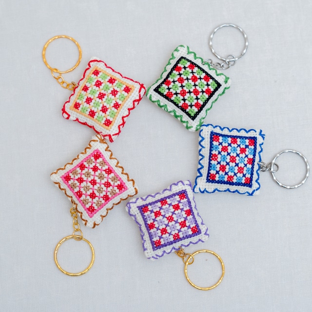 ちいさなクッションのようなキーホルダー。 「ベツレヘムの星」と呼ばれる星のモチーフがクロスステッチで描かれています。 *パレスチナ刺繍は2021年から世界無形文化遺産です。 ============ ◆素材 刺繍糸 綿100% 生地 化繊100% ◆サイズ 約4cm ◆種類 番号からお選びください 数点ずつの入荷の為、金具の色はお選びいただけません。 ===== ◆返品について 商品は一点一点手作業で作られており個体差がございます。また、スクリーンでご覧いただくお色味と実際の風合いが異なる場合がございます。予めご理解のうえご購入いただきますよう、お願い致します。 欠陥以外に、お客様都合による返品交換には応じられませんので、ご了承くださいませ。 ◆ショッピングガイド https://kakehash.thebase.in/p/00002 ===== ◆伝統文化について パレスチナ刺繍は、その歴史の深さから世界無形文化遺産に指定されています。 母から娘へ、次の世代へと受け継いできた刺繍は、古いもので紀元前に遡ることが出来ます。 赤はお祝い事や若さを指し、逆に紺は喪や老齢を指すなど、色遣いにも意味がありました。 刺繍を見れば地域が分かるほど特徴のあった文化ですが、1948年のイスラエル建国で故郷の村を失い、難民となり、途絶えてしまったり、他の地域と交わって変化し続けています。 ◆作り手「Holy Land Handicrafts Cooperative Society」について 中東で一番古い世界フェアトレード連盟(WFTO)加盟団体です。地域の小さな工房で製品をつくり、事務所でまとめて巡礼客や海外へ販売。約2,000人の暮らしを守っています。拠点はキリスト教徒が多く暮らす、パレスチナ・西岸地区のベツレヘムという町です。 当店は事務所スタッフのアミラさん、バスマさんと直接やり取りをして商品を仕入れています。 ◆なぜパレスチナとフェアトレード? 店主は大学生の時にパレスチナでホームステイをし、人があたたかくて、街並みに歴史が感じられて、食文化が豊かなパレスチナの虜になりました。パレスチナの人達は差別されて追いやられて、文化も否定されながらそこに根を張って暮らしている。だったらうちは「素敵なもの」を通して繋がりをつくろう、とこの地域の手仕事をお届けするお店を始めました。