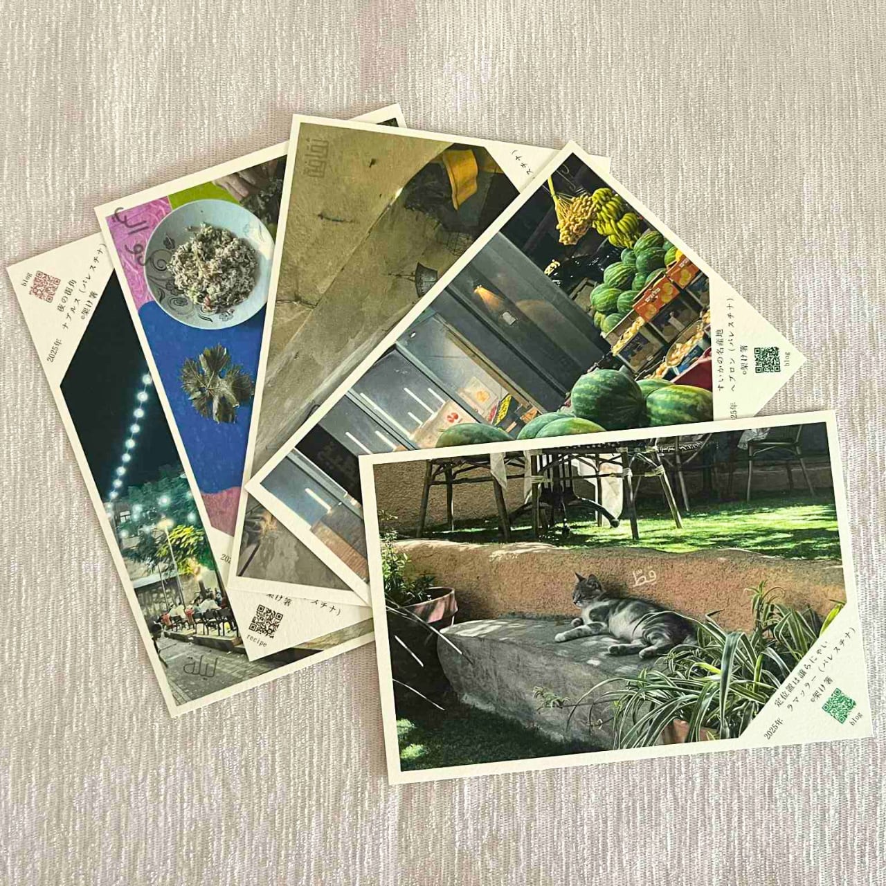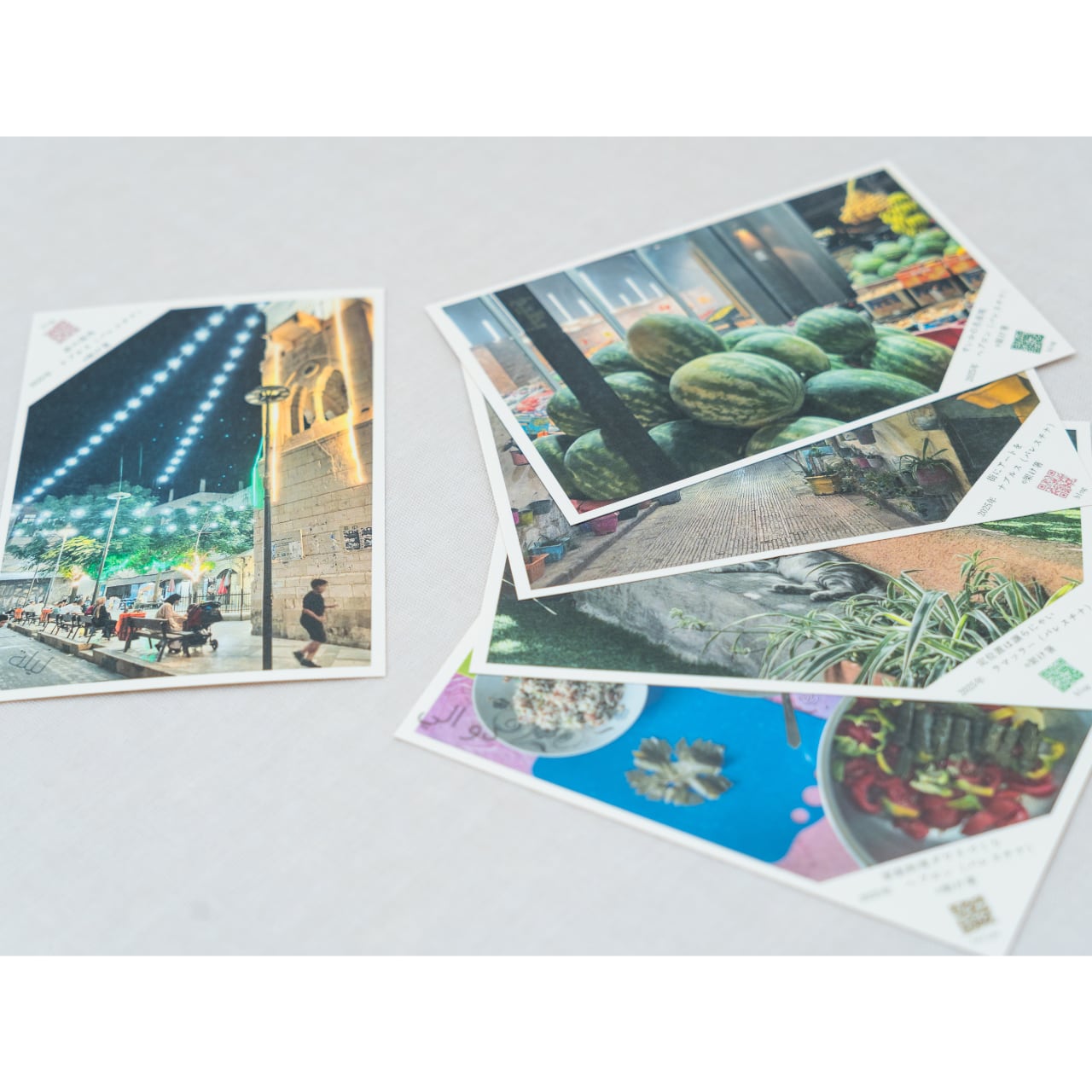 2025年に生産地パレスチナを訪れた際の街角の写真をポストカードにしました。