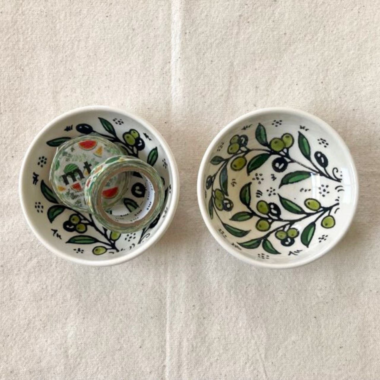 転写ではなく、一点一点絵付けしているので、塗料のはみ出しや、筆の跡、器の凹凸があります。工房での作業を想起させるようなこれらの特徴は欠陥ではありませんので、ご了承の上お求めください。