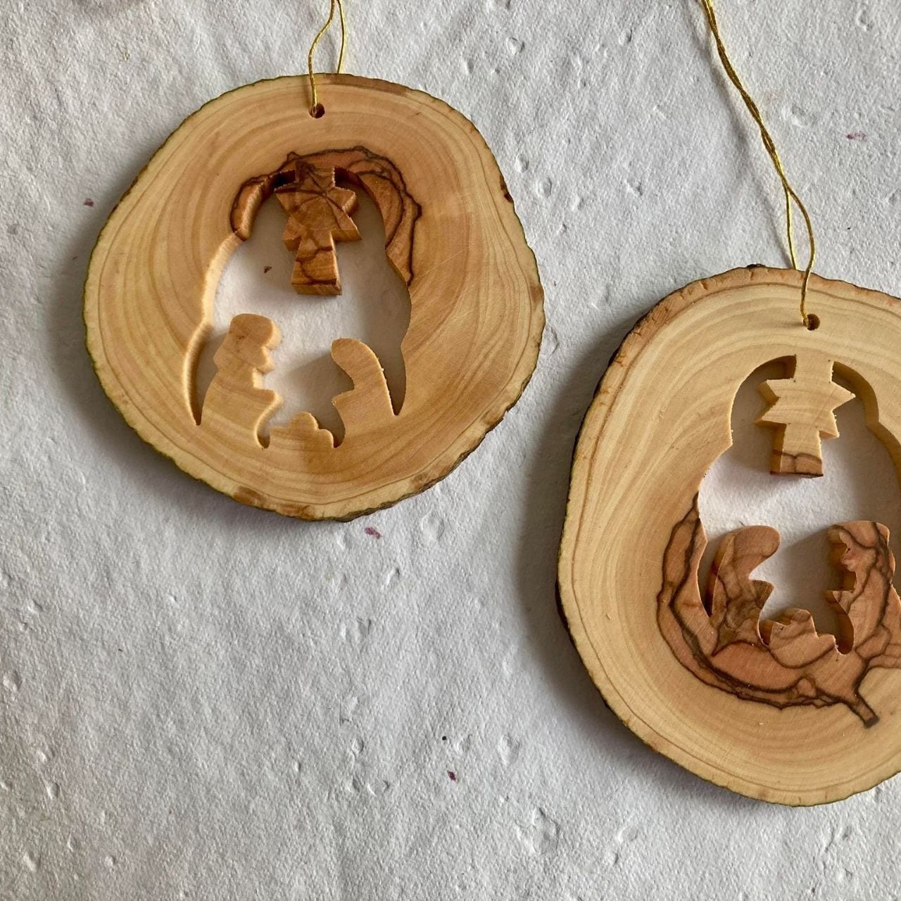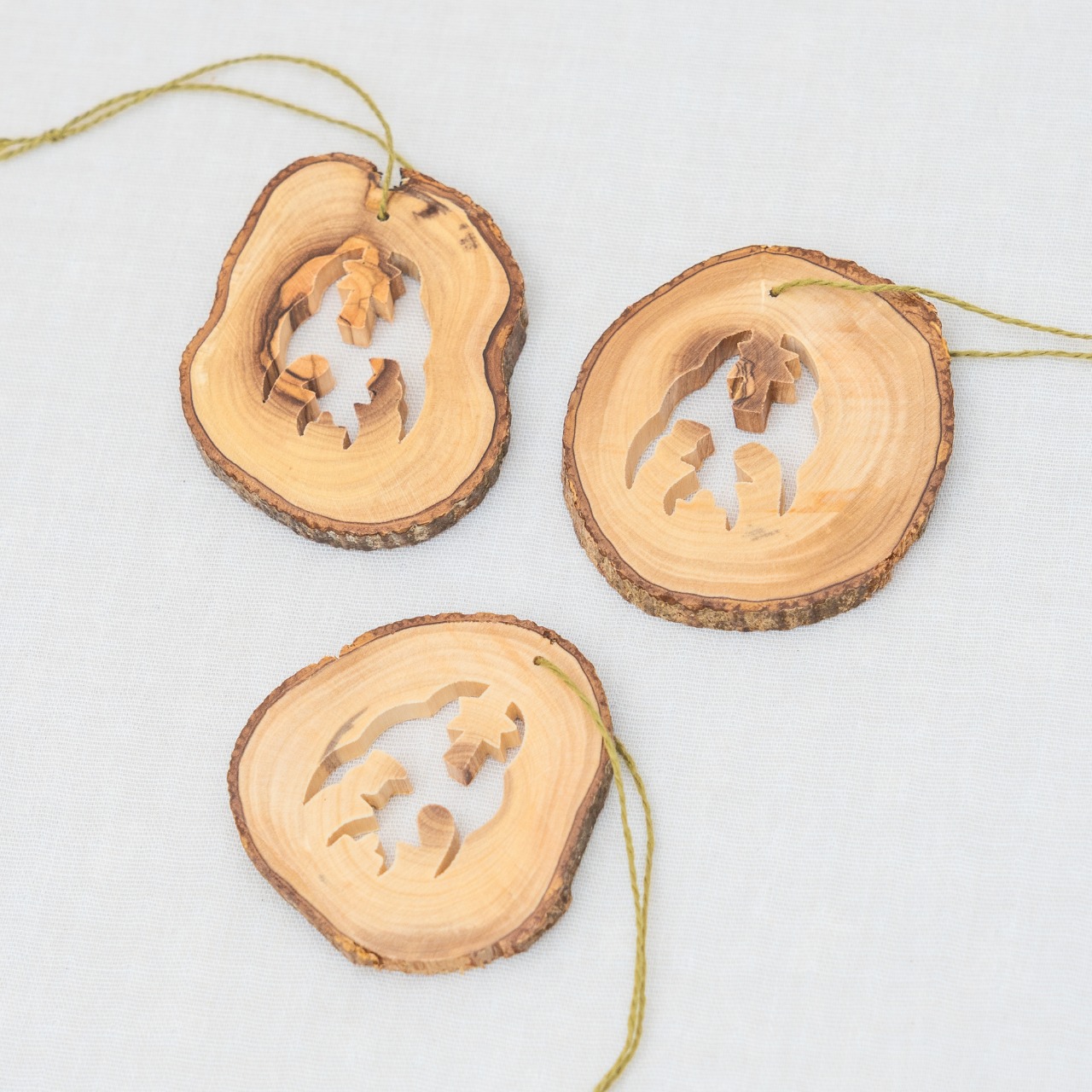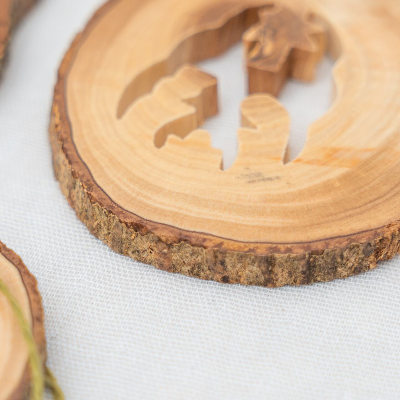切り株のなかに世界で初めてのクリスマスが表現されたオーナメント。